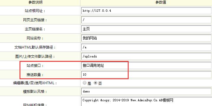 2. 安装完成后,在系统的基本参数设置中,您将看到站点接口和推送数量这两个参数(参考图2)。