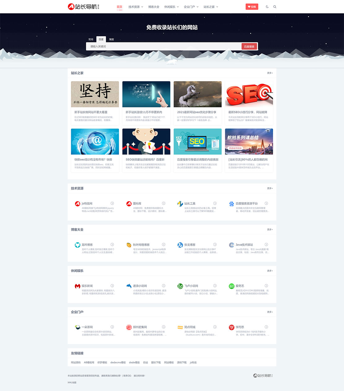 一款简洁好看的织梦cms站长导航类网站模板,页面响应式设计。兼容移动设备和主流浏览器。包含:技术资源、博客大全、休闲娱乐、企业门户、站长之家等模块页面。别人可以提交网址给后台审核收录,从而快速提高网站人气。 压缩包里有安装说明。 内容加载中..